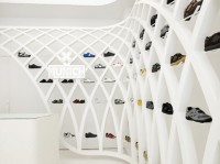sign by Dear Design studio, is very minimal, yet very impressive. Its all white color, the complex X display structure, seem to expand the display surface at libitum, giving to the full range of Munich Shoes on diplay the deserved importance.