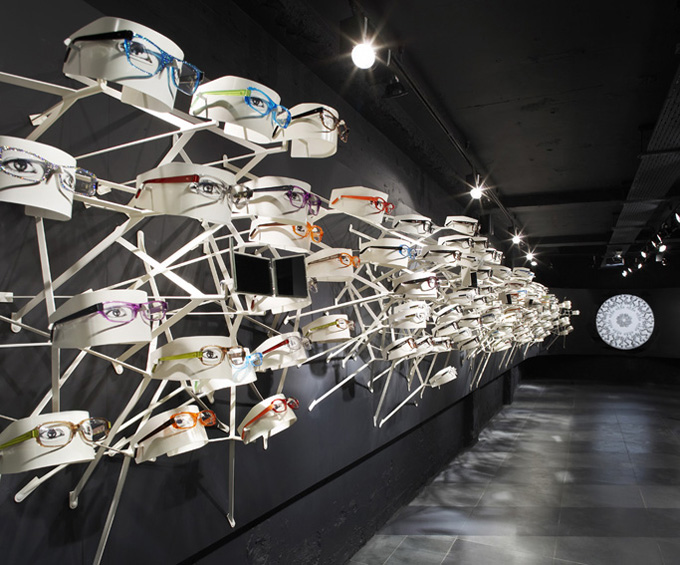Kirk Originals flagship store, on the opposite, looks very unusual, and the only one eyewear wall with 187 “heads” for frames, and practically no furnishings ensure that customers will focus on the eyewear, not the trappings. Eye examinations and fitting take place in the basement, away from the main display space.
